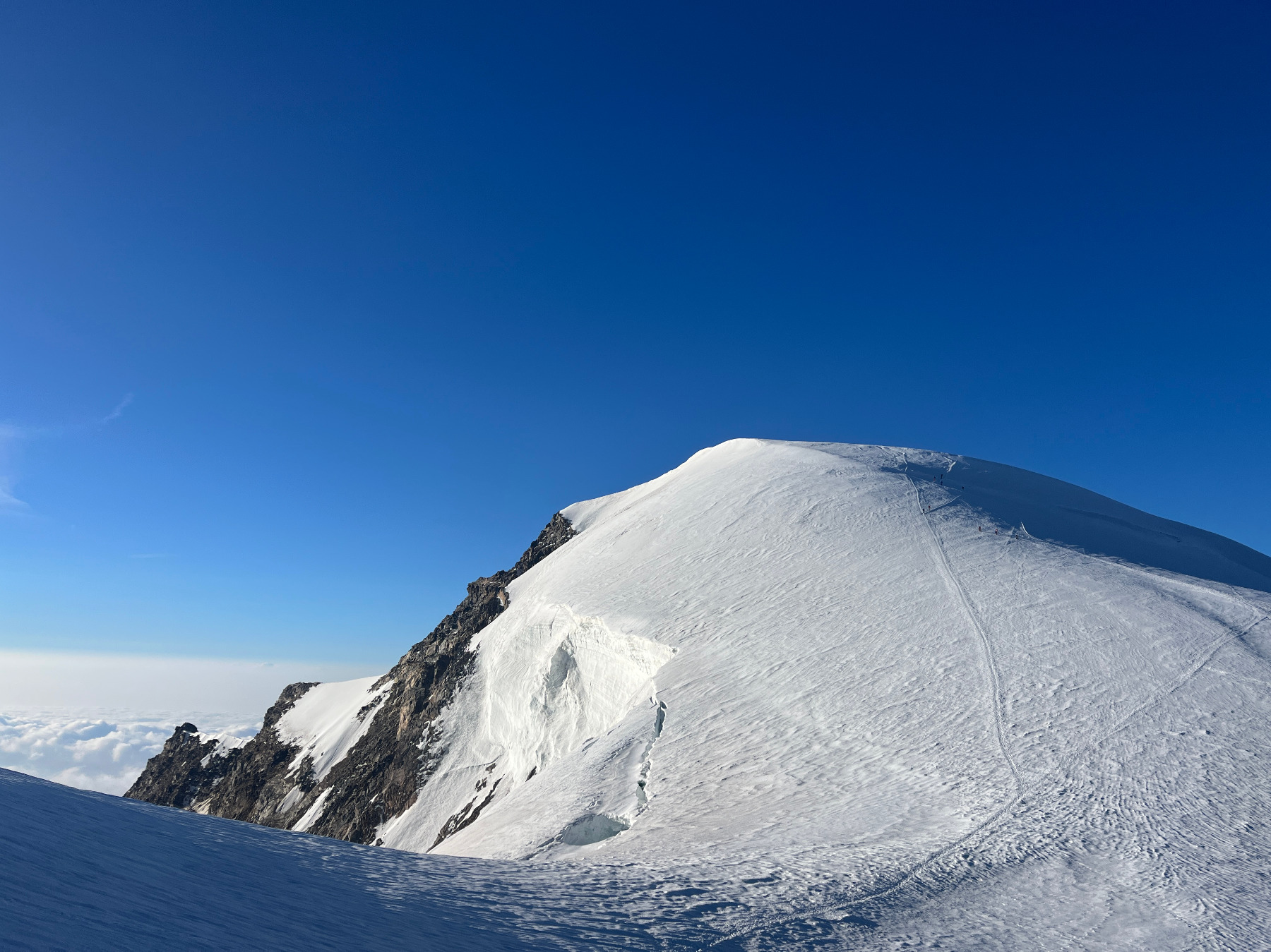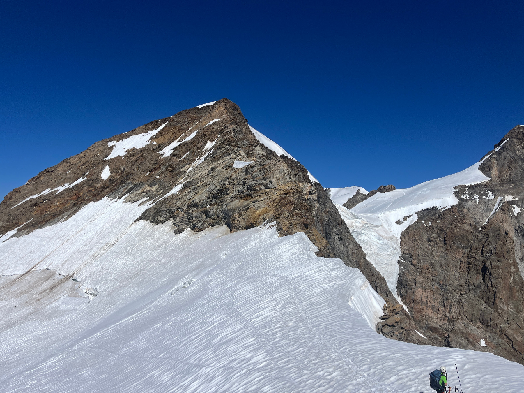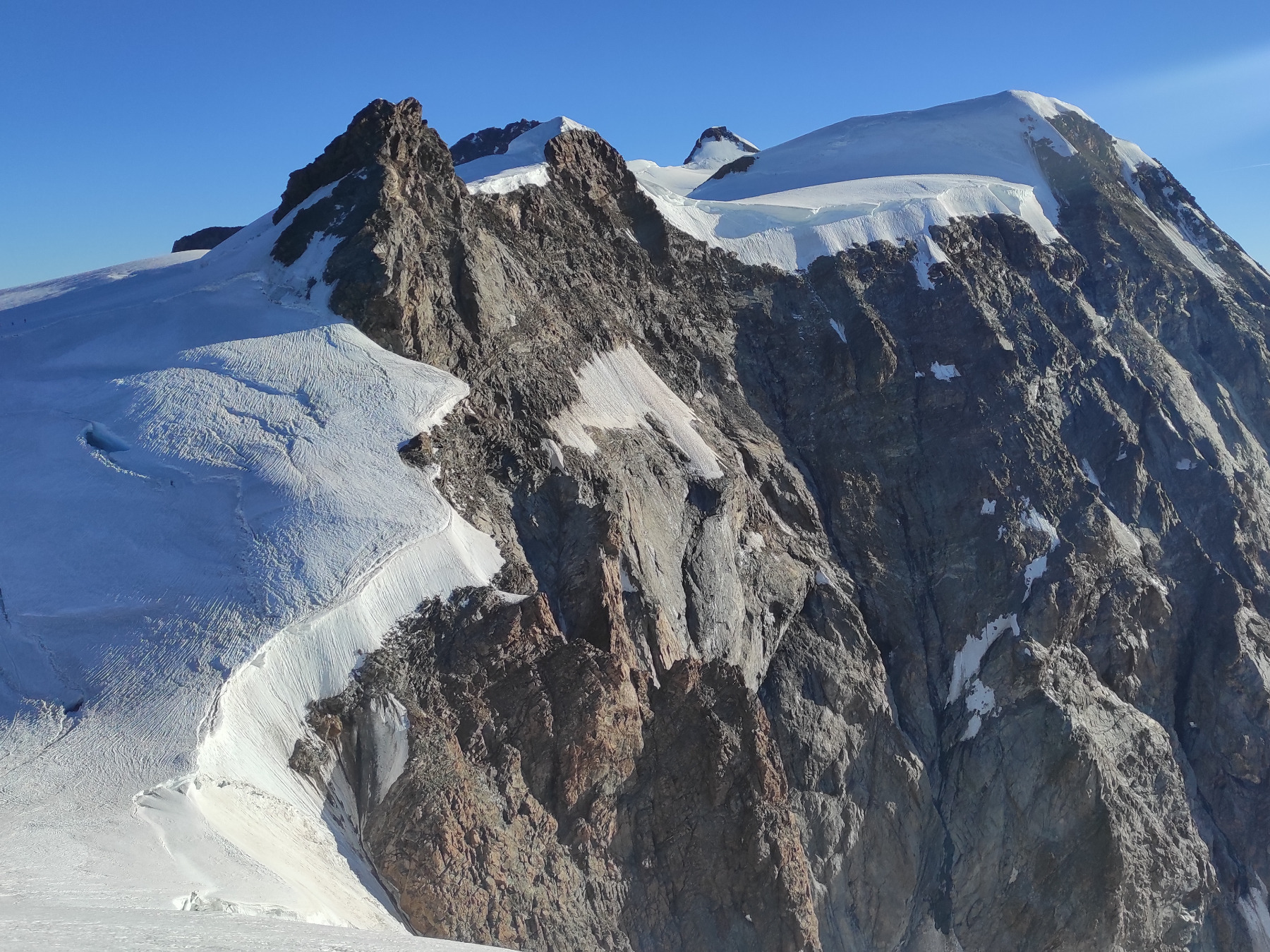 День восхождений начинается рано, еще затемно выходим в направлении первой вершины Punta Giordani. Дальнейший маршрут нанизывает пирамиду Винсент, Балменхорн и тп в нитку траверса логически завершаясь на высшей точке итальянской части Монтерозы - Зумштайншпице. Спускаемся по ледникам обратно в хижину и далее к канатке и парковке.