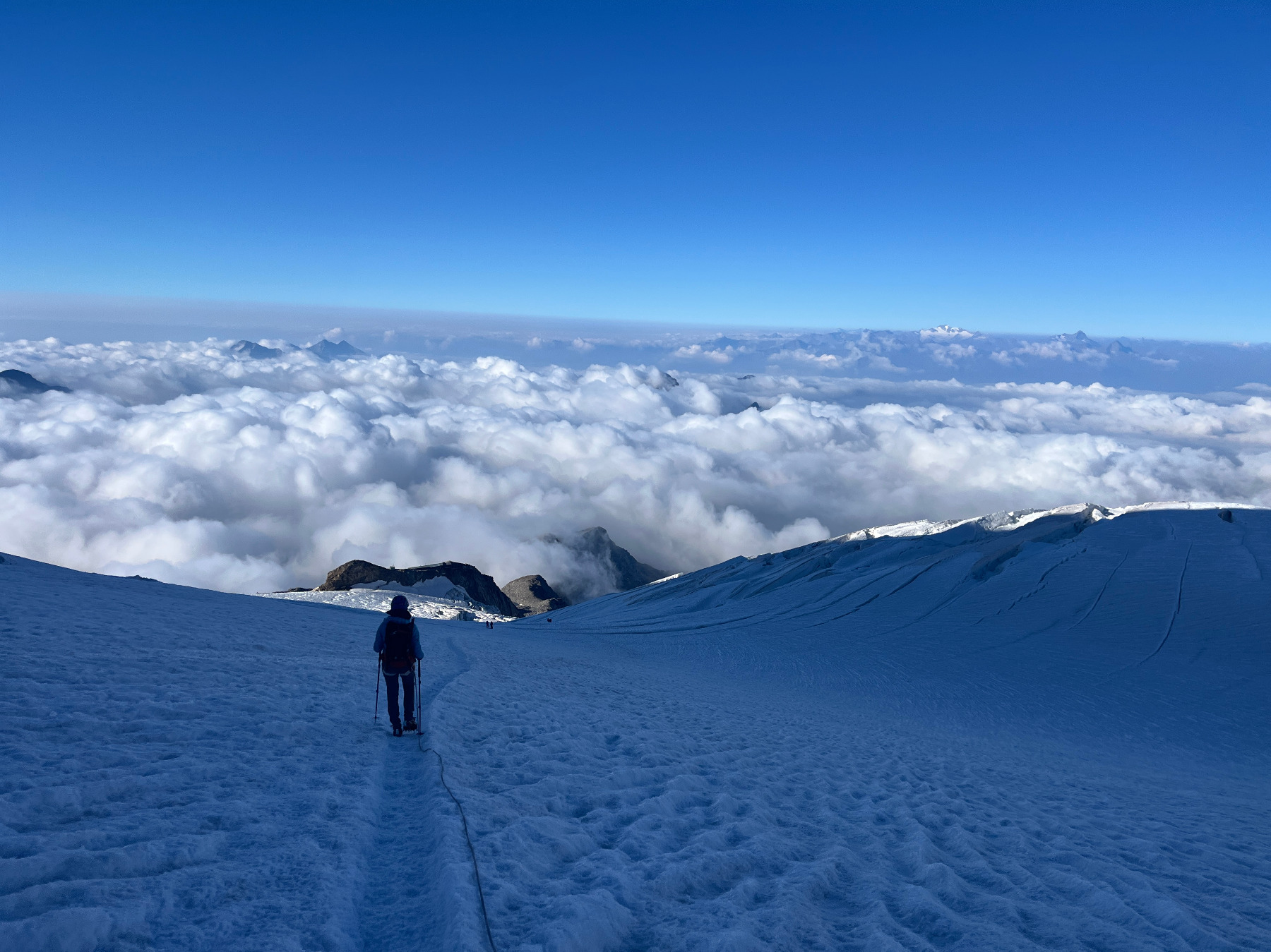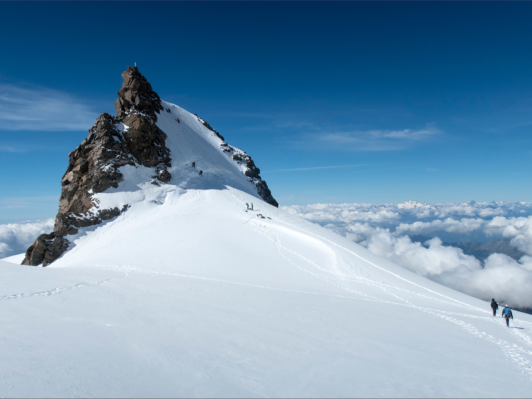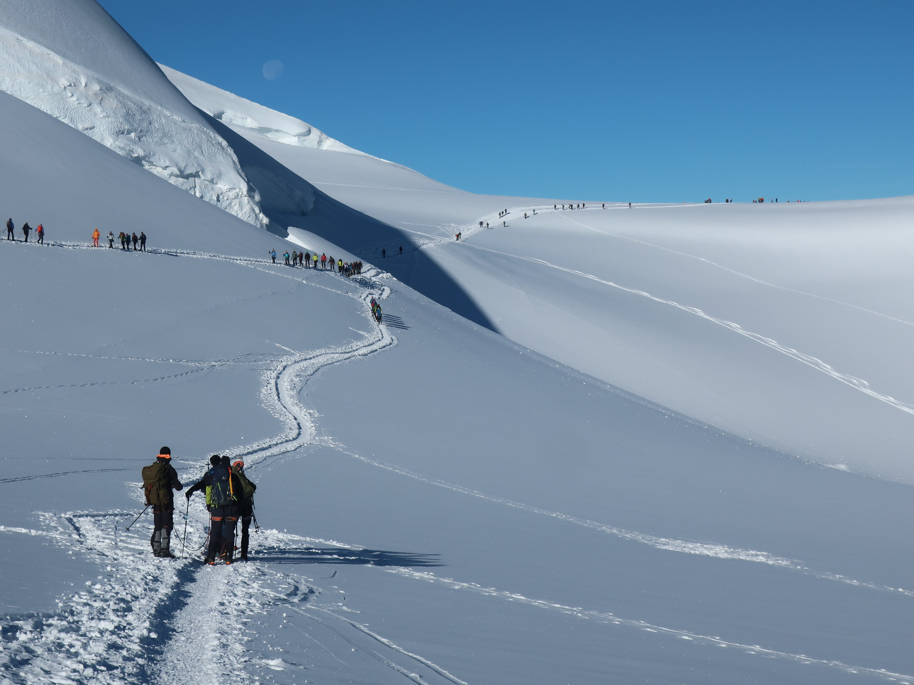 День восхождений начинается рано, еще затемно выходим в направлении первой вершины Punta Giordani. Дальнейший маршрут нанизывает пирамиду Винсент, Балменхорн и тп в нитку траверса логически завершаясь на высшей точке итальянской части Монтерозы - Зумштайншпице. Спускаемся по ледникам обратно в хижину и далее к канатке и парковке.