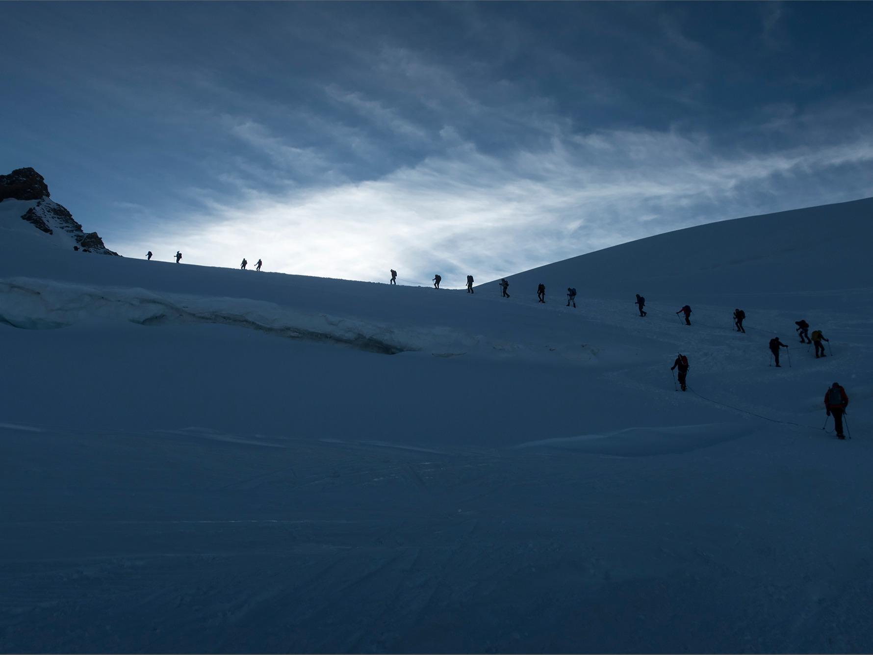 Ранний старт. Траверс вершин в соответствии с текущими подгодными условиями и состоянием ледников. Спуск в долину.